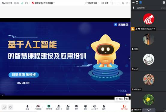 为提高公司教师信息化教学水平,充分利用超星平台资源,推动公司产品改革,威廉体育williamhill特邀请超星平台陈媛媛老师,于2025年2月18日举办了一场线上实操培训及人工智能赋能公司产品讲座,威廉体育williamhill全体教师均参加了此次讲座。