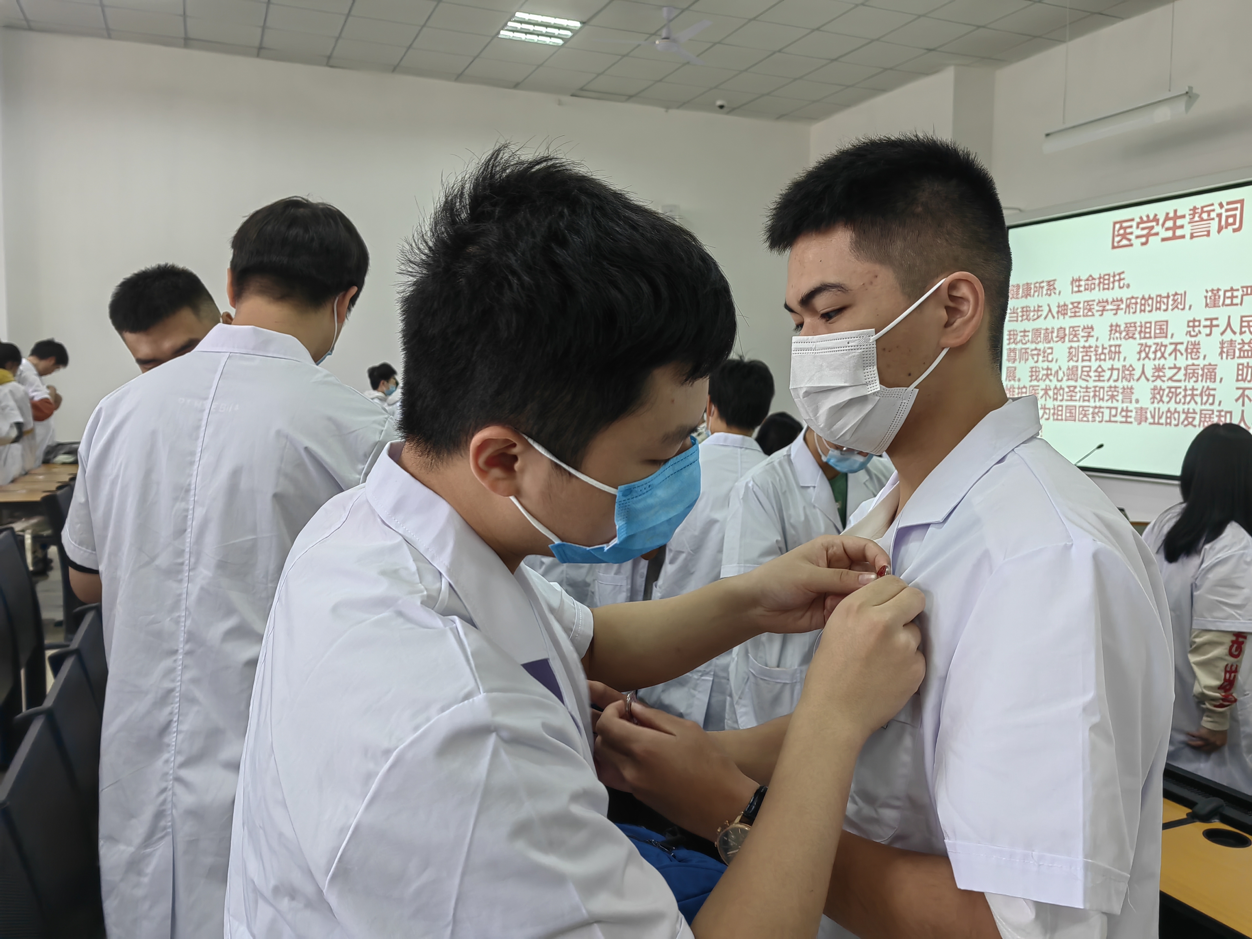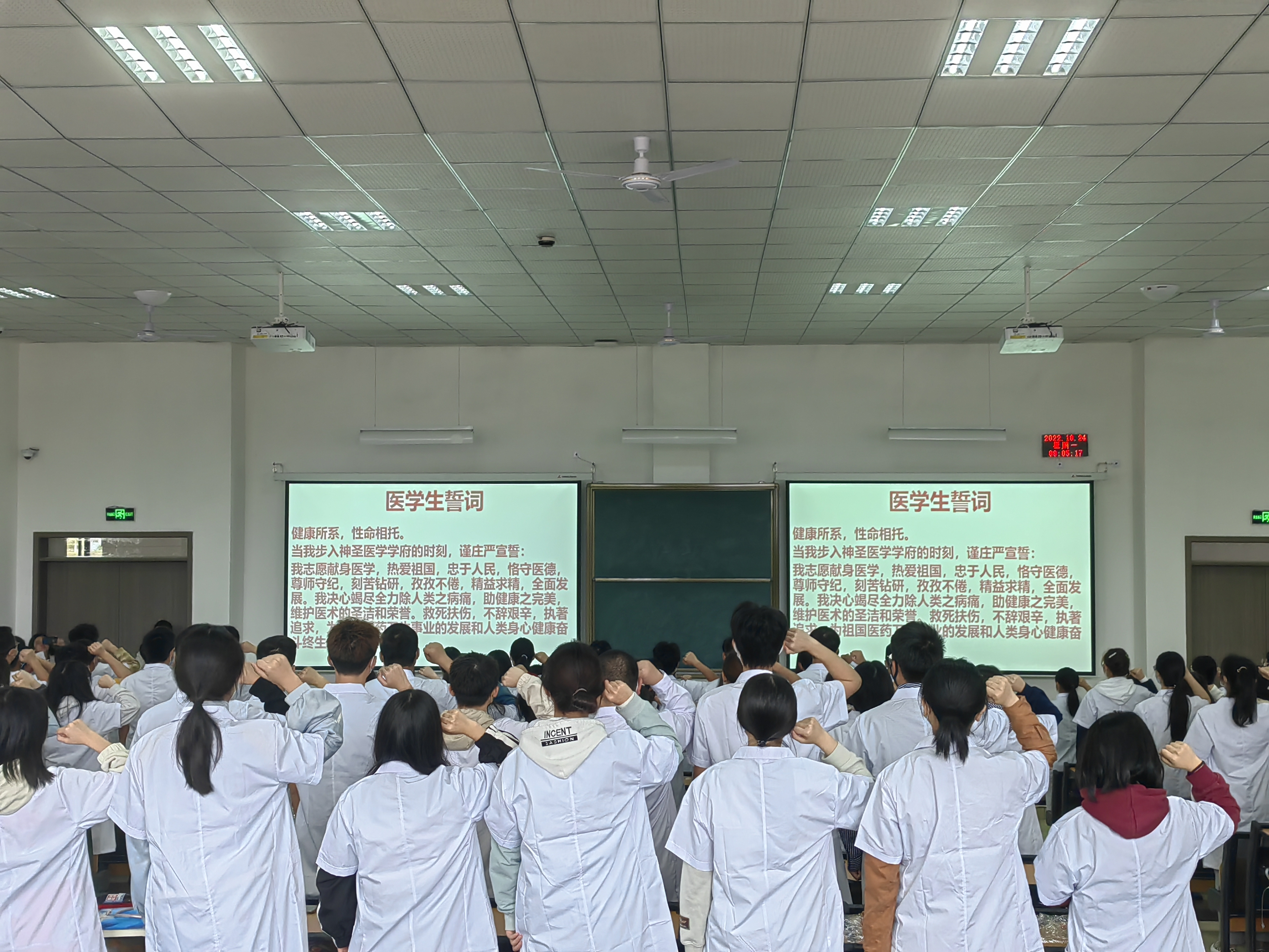 接着,举行了校徽佩戴仪式,全体新生在现场集体佩戴了校徽,熠熠闪光的校徽既是“遵医人”的象征,更是“明德笃学 求是致用”的精神载物。同时,为了巩固医员工的专业思维,感知医学的神圣,公司特意组织了充满仪式的宣誓环节,由威廉体育williamhill经理刘兴奎教授带领全体新生进行医员工誓言宣誓,神圣的医员工誓言声声入耳,句句入心。